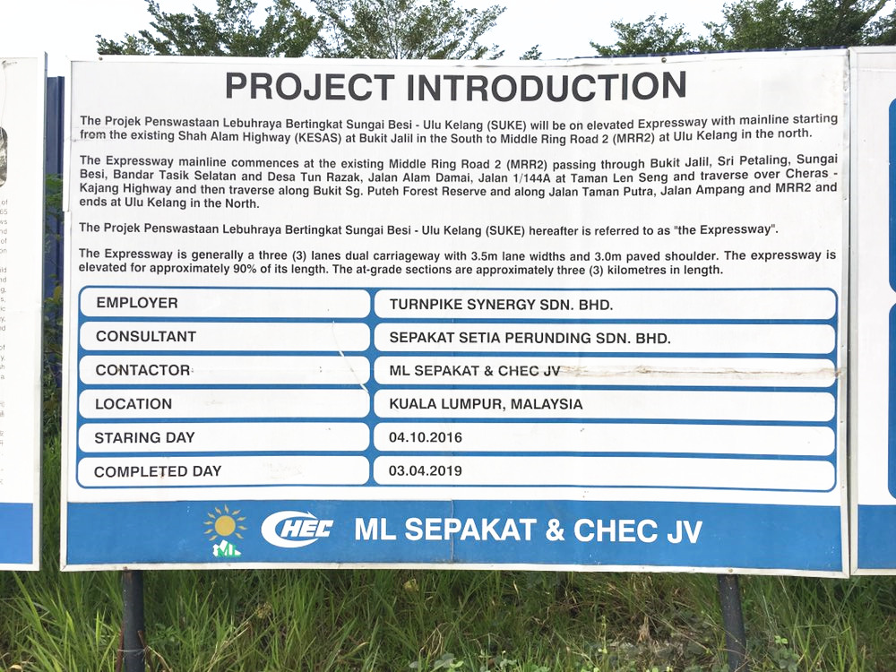 SUKE CA4項目是由中交集團中國港灣工程有限責任公司承建的高速公路項目。項目起于吉隆坡皇家警察學院附近,跨越既有高速公路,MRT輕軌,穿越森林保護區(qū),止于吉隆坡塔曼武吉塞加爾附近,橋區(qū)內主要為山嶺重丘地形及現(xiàn)有道路兩側。橋梁共計18座,共11129米。路基共19處,共4348.9米。
